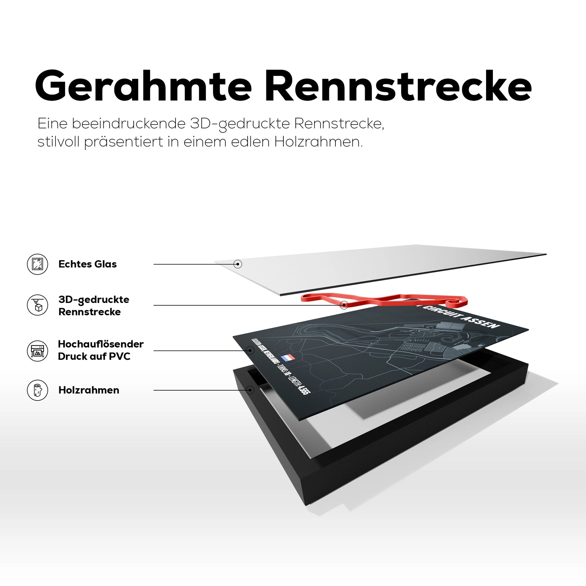 Unsere Rennstreckenmodelle werden mittels präzisem 3D-Druck aus hochwertigem PLA-Kunststoff gefertigt. Dies erlaubt die detailgetreue Nachbildung komplexer Strukturen und verleiht dem Kunstwerk seine charakteristische Tiefe.